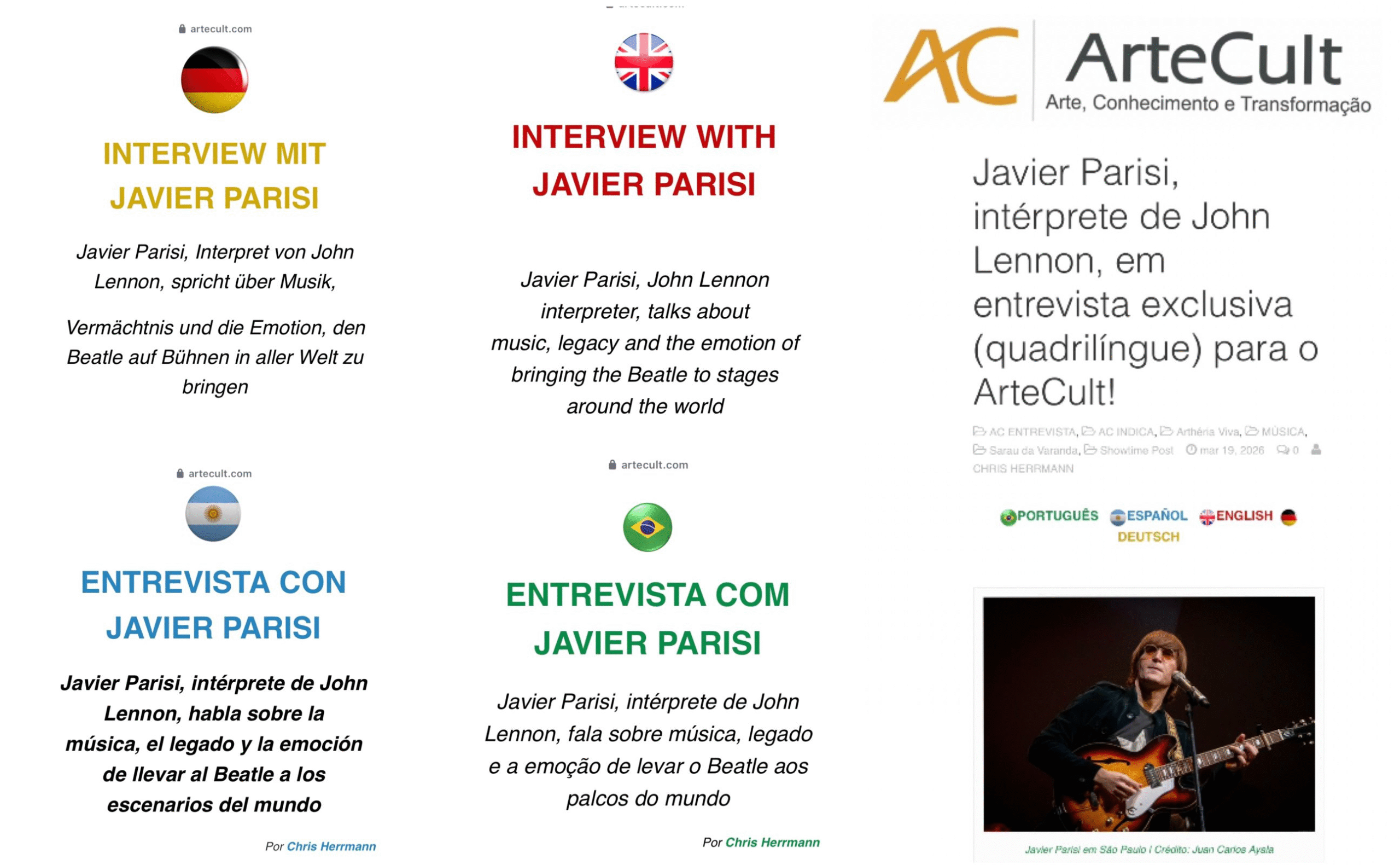 Home Blog Now you can read the complete interview conducted it by Chris Herrmann for “Arte Cult” in 4 languages just tapping on the following link. Enjoy it! Now you can read the complete interview conducted it by Chris Herrmann for “Arte Cult” in 4 languages just tapping on the following link. Enjoy it!Javier ParisiMarch 19, 2026Blog Javier Parisi, intérprete de John Lennon, em entrevista exclusiva (quadrilíngue) para o ArteCult!
